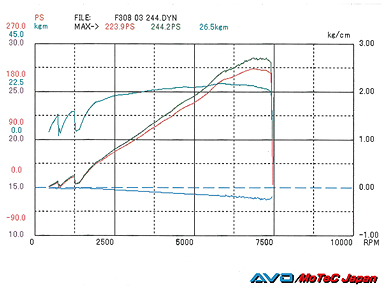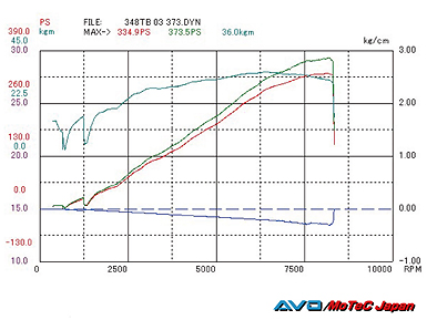 コメント : GTBはカタログスペック320ps/33kg-mで、実際に計測してもノーマルは300psくらいなのですが、ハイカム、BIGバルブ、強化バルブスプリングが組まれ、F355の8連スロットルと360モデナのインジェクターが移植されているため、MoTeC M800でセッティングを詰めたところ373psという驚くべき数値を叩き出しました。【詳細記事】