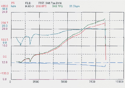 コメント : 「次のクルマの事は、考えていません。私はこのクルマを、ずーっと乗り続けます!」という熱いオーナー様の愛車です。納車時は始動が困難だったり、始動しても片バンクだけのような状態でしたが、機械的なトラブルや電気的なトラブルを解消した結果は345ps。あと3馬力出れば語呂が良いのに…と思いましたが、トルクの数字がしっかり348でした(笑)