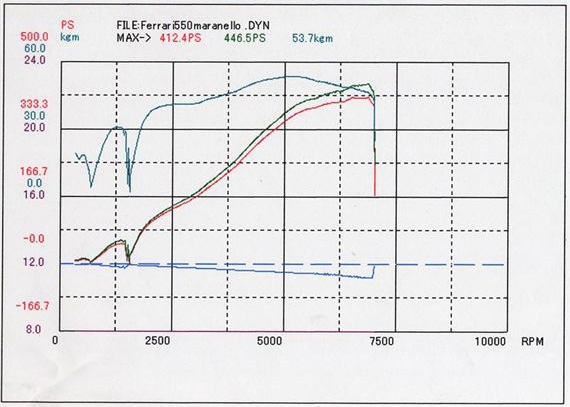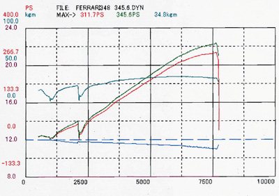エンジンコンディションを確認していないので、これがF355の限界値かどうかは判りませんが、アクセルを抜いた時点でパワーが落ちていないため、踏めばまだパワーは上がると思います。