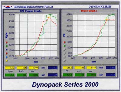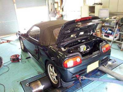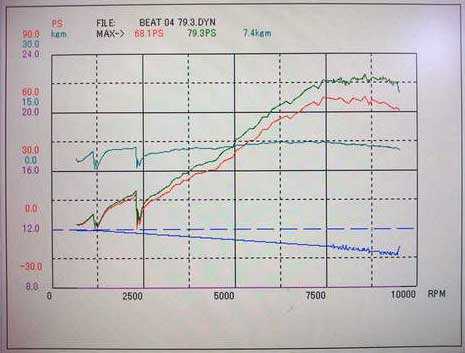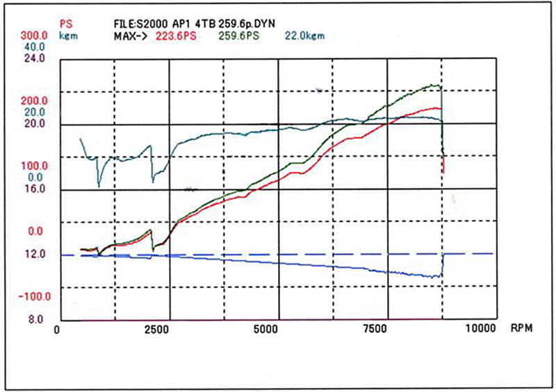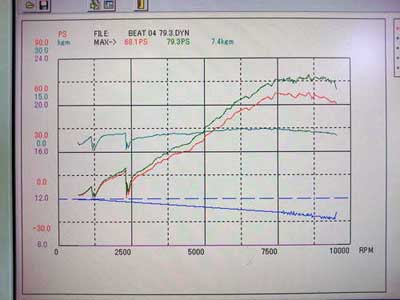 エンジンベンチで調整を終えたエンジンを、ストリートで乗りやすくなるように、街乗り部分を調整させて頂きました。パワーバンドの領域は、エンジンベンチでのセッティングがパーフェクト過ぎなので手を付けず、そのままです。レブリミットは9500rpm。レースで実証済みなので、自信を持ってこの回転に設定していることが伺えます。もっと回せば、間違いなくパワーが上昇するパワーカーブです。
