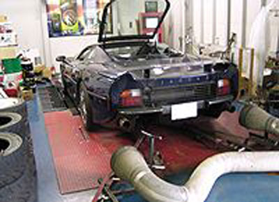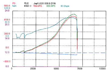 コメント :不等間隔爆発の90度V6、ツインステージインジェクション(12本インジェクター)、左右バンク独立スロットルで、純正は550ps/65.6kg-mというスペックです。 モーテックM800でエンジンとタービンをコントロールして、830.9ps/93.2kg-mという驚異の出力を達成しました。 カタログスペックの最高速347km/hを上回り、車名の由来となっている220マイルをクリアする最高速を達成しました。