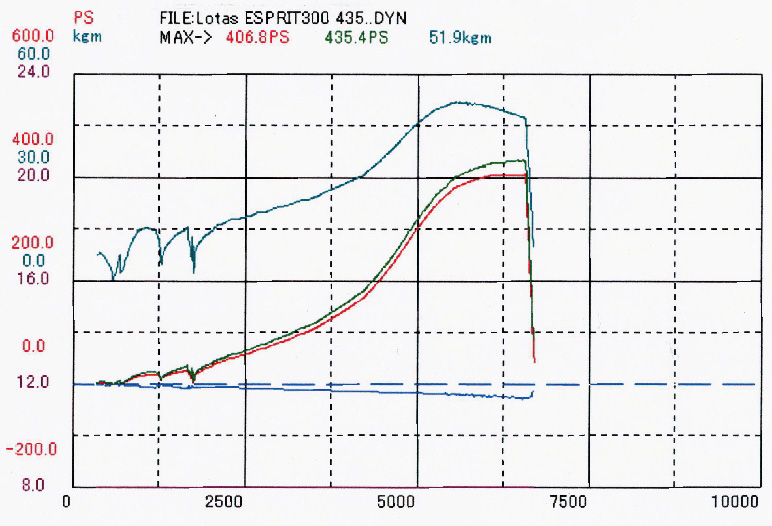 コメント : ロータスのホモロゲーションマシンで、300psにメーカーチューンされていることが名前の由来だそうです。オーナー様はフレームの強化、タービン、燃料ポンプの交換など、プライベートで製作されています。セッティングすると、タービン交換の効果が発揮されて、軽く435psを叩き出してしまいました。エスプリスポーツ435に改名が必要ですね!(笑)