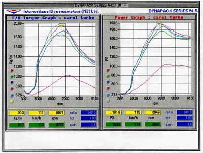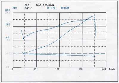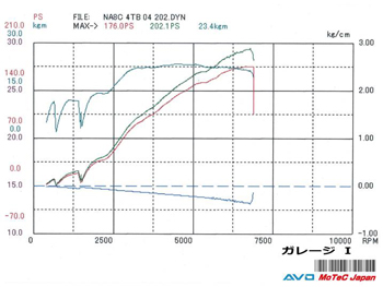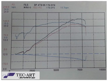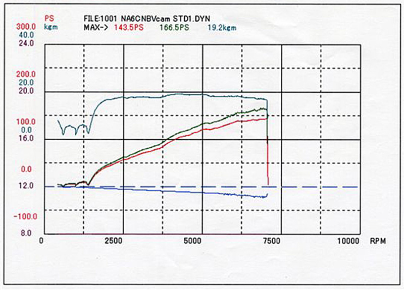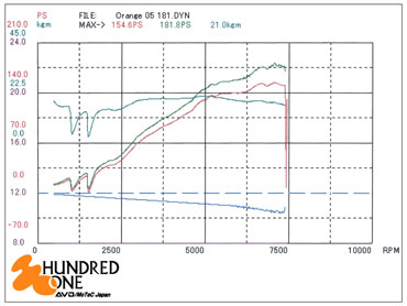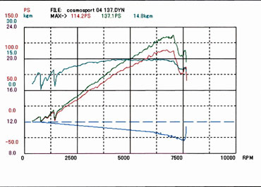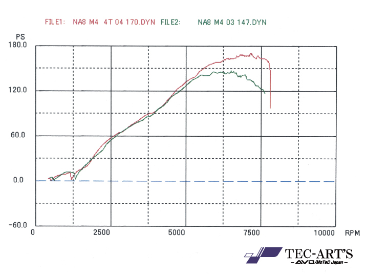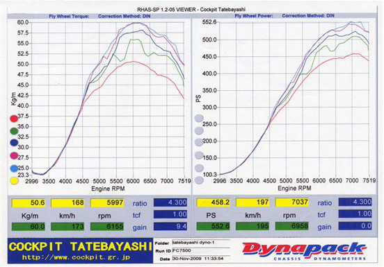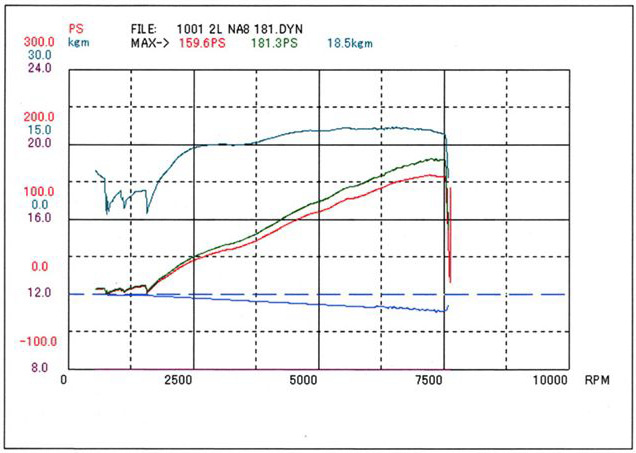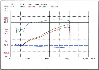まだ排気量アップやポート加工などの「チューニング」ではなく、「パーツ交換のみ」の段階ですが、すでにカタログ数値の130ps/16kg-mから、この時点で40.4ps/3.3kg-mの出力アップを実現しているのが驚きです。【詳細記事】