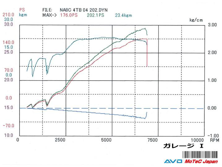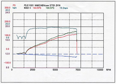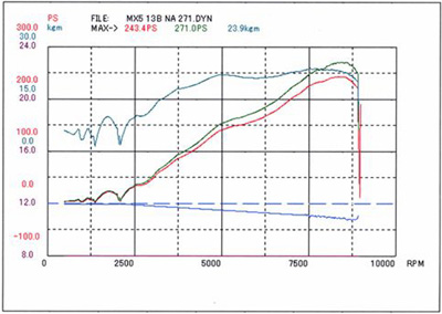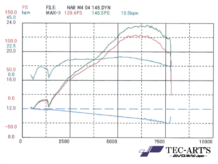 モーテックM4で詰めた結果、低回転域から高回転まで、フラットにトルクが出ました。車体の軽いNA8Cには、とても良いマッチングです。