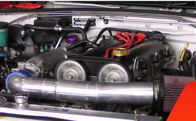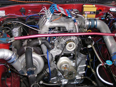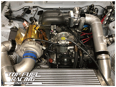 エンジンと同じくらい大きく見えるギャレットGT42タービンを組み、インタークーラーレス、ワンオフのチタン製サージタンクと、迫力のあるエンジンルームです。