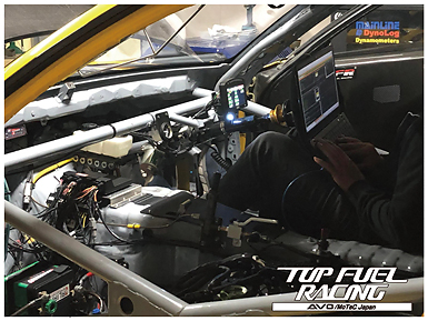 セッティングの数日前にローラータイプのシャーシダイナモで軽い馴らし運転をおこない、1キロ以下のブーストで失火が発生しないかチェックをしていました。その時点で460psオーバーだったため、実走に近い負荷を掛けられるダイノパックをお借りして調整することになりました。