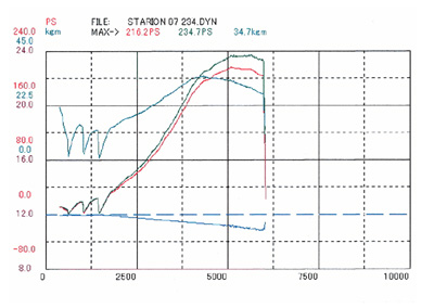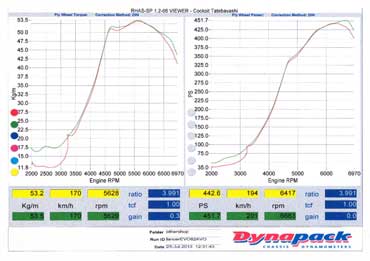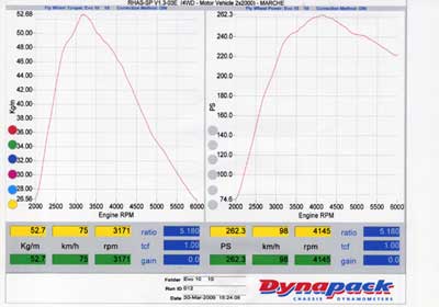 ダイノパックでTCF補正1.00で計測した262.3PS 、52.7Kg/mの数値の大きさはグループNでラリーされている方にしかあまり意味がないかも知れませが、少ない空気の中から少しずつ絞り出した貴重な馬力です。
