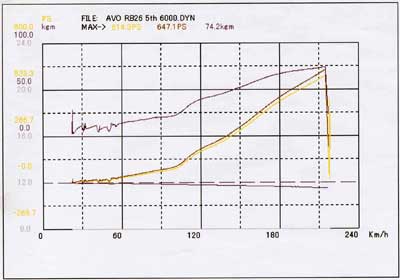 出力はNOSなしで550ps(赤いライン)、NOS噴射で590ps(緑のライン)です。