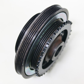 ちなみに、このように高出力&高回転化したRB26には、ひとつ問題が発生します。それはクランク角センサーのエラーです。高回転で正確に回転信号を読めなくなると、正確な制御ができなくなるため、画像のようなダンパープーリー用の歯を削り出しで製作しました。この歯を読むクランク角センサーを取り付けることで、高回転まで精密なエンジン制御が可能となります。モーテックECUならば、このような社外センサーにも対応可能です。