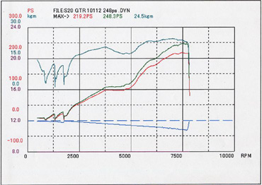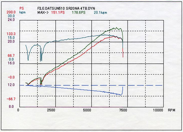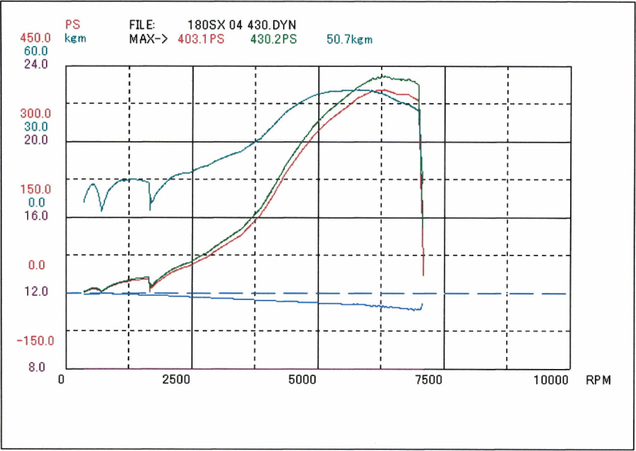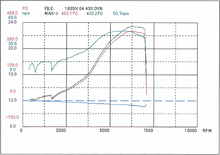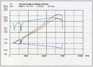 コメント : ターボではないNAのSR20DEをベースにした、4連スロットル仕様です。2年前にセッティングした際は251.7ps/23.4kg-mでしたが、今回は腰下を2.2L化したためリセッティングです。