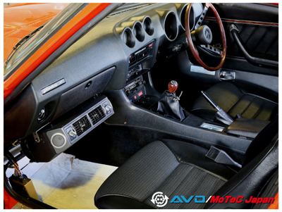 コメント : エンジンは完全ノーマルのL28で、点火コイルとプラグコード以外は「すべて新車当時のまま」の雰囲気を残すエンジンルーム。MoTeC制御化に際に、エアフロメーターを撤去してストレートパイプに吸気温度センサーを取り付ける作業を、郷田鈑金様がおこなっています。完成したZは、気持ちよく伸びるエンジンフィールと共に、燃費も大きく改善しました。【詳細記事】