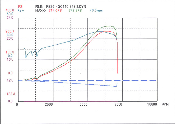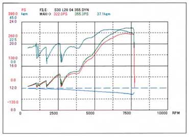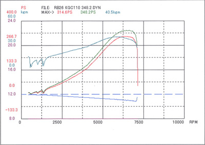 コメント :LDクランクを使った3.1L仕様です。ブローした状態で入手したお客様が、水上自動車にてエンジンオーバーホールしたそうです。実走とシャーシダイナモでセッティングを詰めたところ、355ps/37.1psという結果になりました。