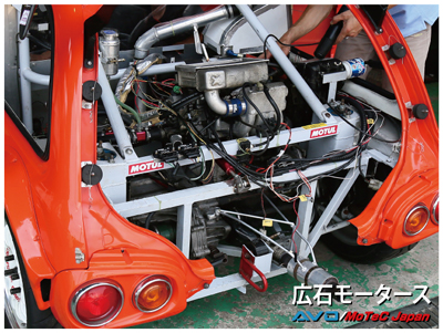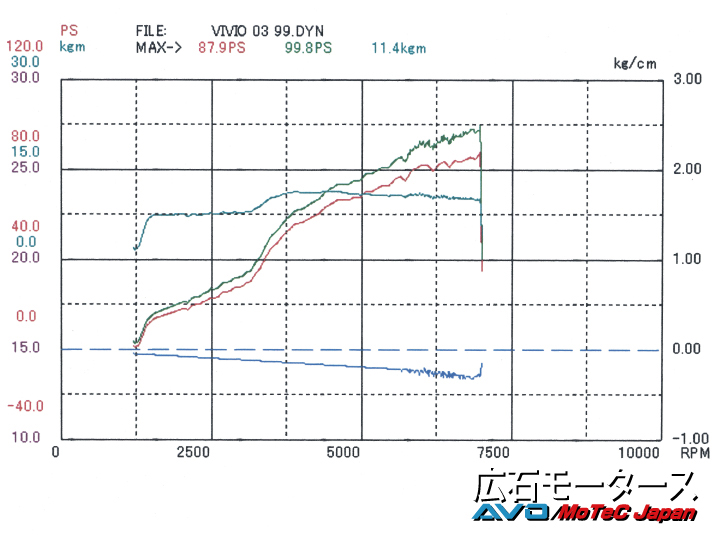 コメント : 富士スピードウェイのK4-GPに出走するために製作されたレーシングカーです。外観はVIVIOですが、サンバーのシャーシを使ったミッドシップで、マクラーレンF1のような中央にシングルシートが鎮座しています。エンジンはノーマルですが、純正はスーパーチャージャーの過給圧をバイパスさせるリミッターがあるので、それを使用してHi/Loブーストの切り替えができるようにしてあります。セッティングの結果は、Loブーストで82.8psでしたが、Hiブーストでは99.8ps/11.4kg-m。グラフでトルクのラインが急激に上昇する部分が、HiとLoの違いです。【詳細記事】