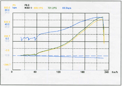 コメント : メタルワークショップM様で製作し、弊社でMoTeC ECUとダッシュロガーの取り付け及びセッティングをおこないました。燃料はガソリンではなく、100%メタノール。タービンはGT4518R(製作当時の最大サイズ。今はもっと大きい物がたくさんあります)で、ブーストは3.1キロです。サクラダイノシステムのシャーシダイナモは設計速度で360km/hなのですが、ホイルスピン防止で5速計測したため、330km/hも回してしまい、シャーシダイナモの限界ギリギリでの計測でした(笑)