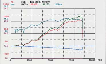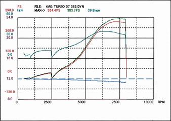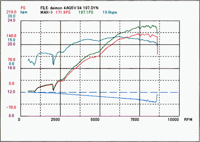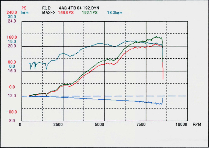 コメント : カムを含めワンオフパーツを使わず、すべて市販パーツを使用して組み上げたエンジンです。高回転で振動が大きいのが4A-Gの弱点ですが、総削り出し5A-Gクランクのお陰で、9000rpmを超えてもスムーズに回っていこうとします。素晴らしいエンジンです。
