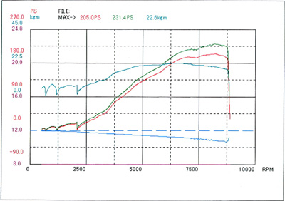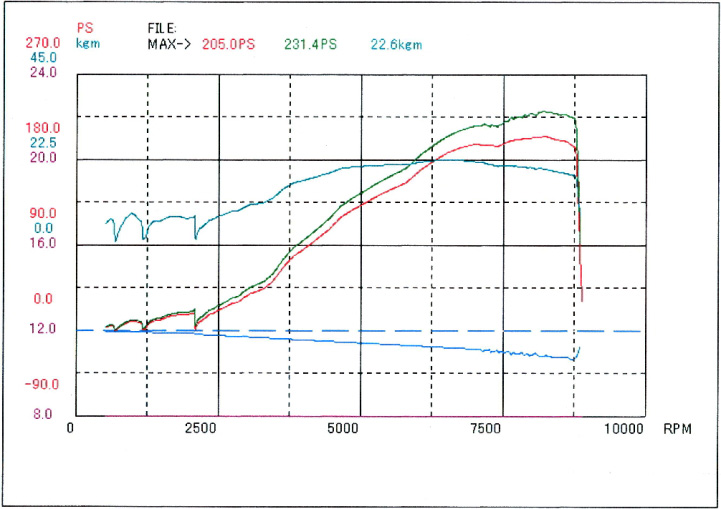 パワーよりもエンジンの耐久性を重視し、レブリミットを9000rpmに設定していますが、9300~9500rpmくらいまで回せば、確実に250psを超えそうです!【詳細記事】