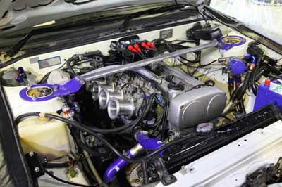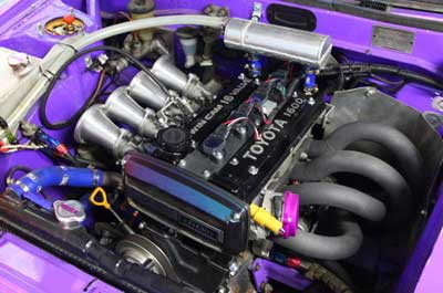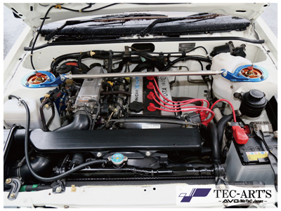 4A-Gに7Aのクランクを組み合わせたフルチューンエンジンに、4連スロットルを装着しています。かなりの高出力に見えますが、テックアートが製作する7A-Gの中では、このくらいの出力は普通です。