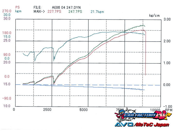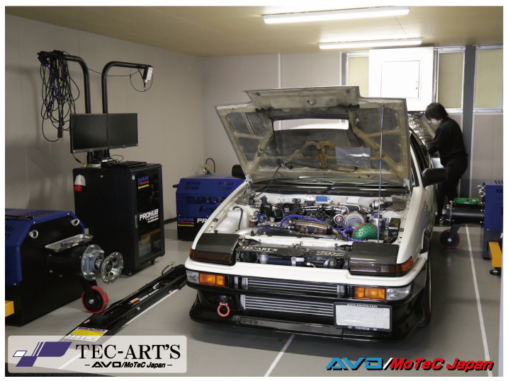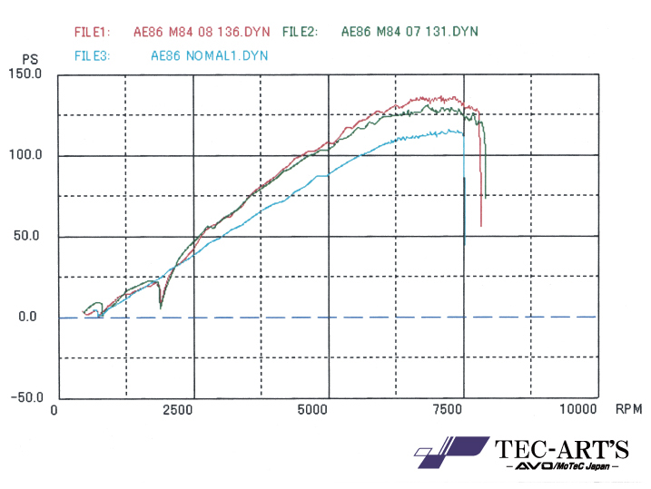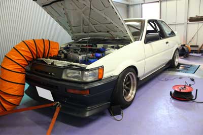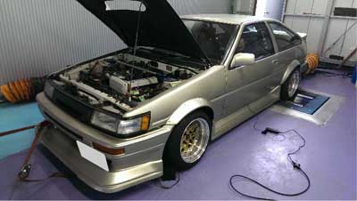 コメント : タコ足とマフラーを交換してあるだけで、そのほかは完全オリジナルAE86です。MoTeC制御する前に、純正ECUでパワーチェックしたところ、115.7ps/13.1kg-mでしたが、MoTeC M84制御で現車合わせをしたところ、131ps/15.6kg-mになりました。サージタンクの負圧が高かったため、試しにエアクリーナーBOXを外してパワーチェックをしてみると、136.9ps/16.1kg-mまでパワーアップしました。【詳細記事】