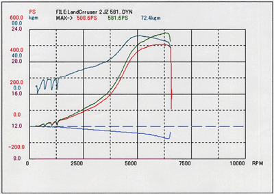 コメント : ほとんどの改造をご自身でやられている、プライベーターのお客様からのセッティング依頼です。エンジンを2JZターボに換装して、MoTeC ECUでエンジンを制御しています。燃料ポンプの容量不足から、目標としていた600psには届きませんでしたが、実走させてみると、とっくに目標とする出力は超えている…と感じるほどの速さでした。